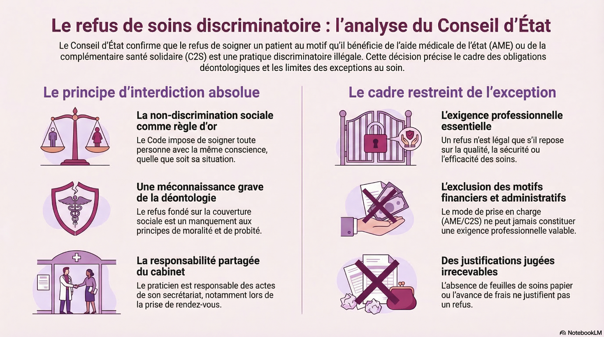 - Le transfert du patient et l’absence de soin urgent : Le fait de rediriger le patient vers un confrère ou un hôpital, même en l'absence d'urgence, ne le délie pas de l'interdiction de refus de soins pour motif discriminatoire.